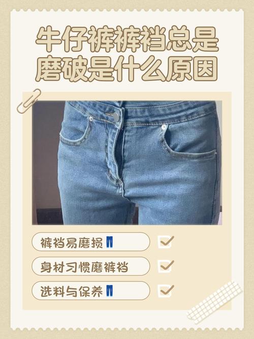 〖Five〗、为了加固容易磨损的裆部,可以将旧牛仔裤剪下的两片布料缝合在新裤子里面。这种方法同样适用于裤子已经破洞的情况,通过石蜡减少摩擦,延长裤子的使用寿命。 穿着牛仔裤时,不要将其提得过高,以免增加裆部的压力。保持裤子靠近髋部,而不是紧贴裆部,可以减少磨损。