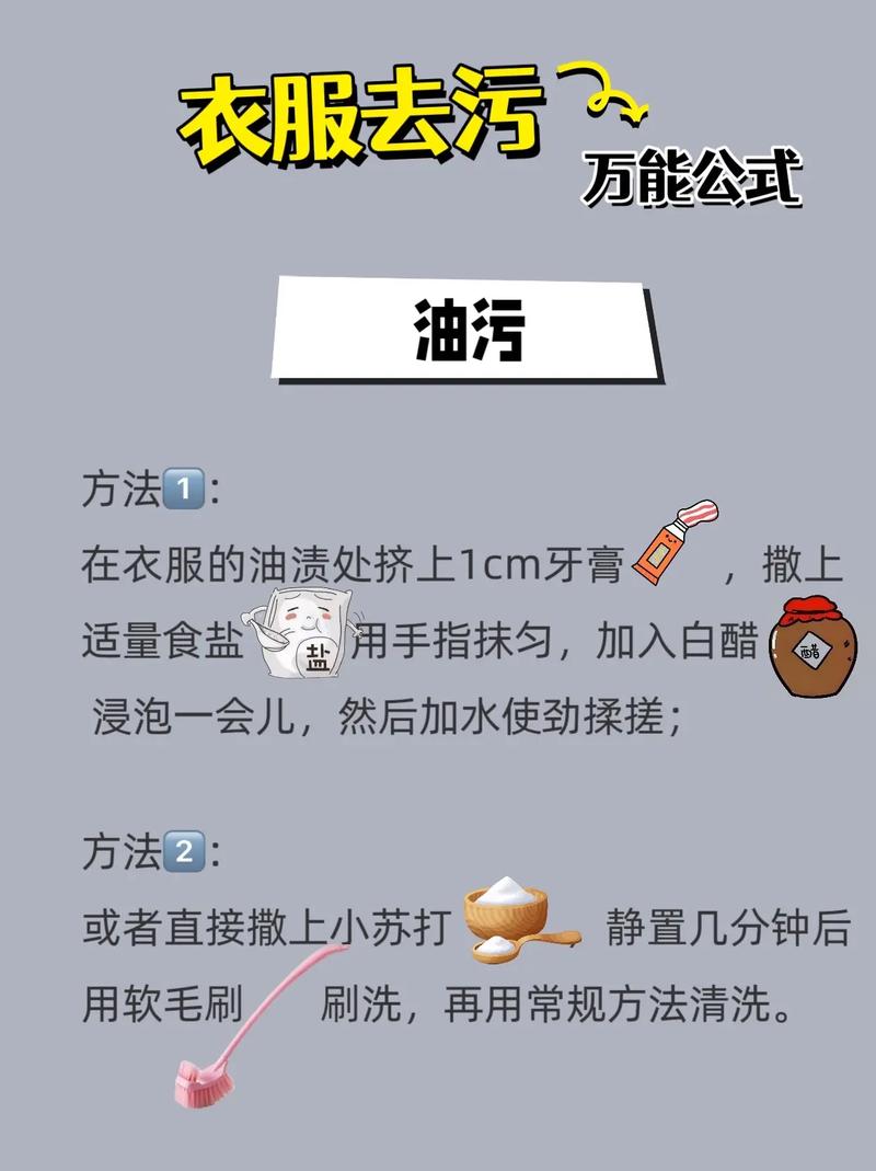 〖Three〗、去除衣物上的陈旧油印子,可以尝试以下几种方法: 热水加洗洁精:将衣物浸泡在热水中,加入适量洗洁精,让油印子部位充分浸泡约十分钟,然后进行正常搓洗。 热水加食盐:将80°C的热水和食盐按比例混合,将衣物浸泡其中,大约5『1』0分钟,随后使用洗衣粉按照常规程序洗涤。