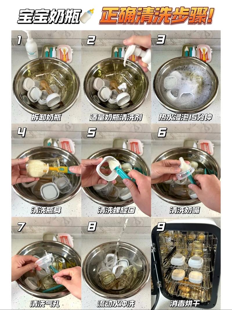 〖Six〗、硅胶奶瓶发黄清洗的几点建议如下:温水清洗:将奶瓶、奶嘴、套环等部件完全拆卸,逐一进行清洗。使用温水清洗,因为温水有助于加快油脂的分散,使油脂从奶瓶表面脱落,避免残留。使用奶瓶清洁剂:奶嘴是容易发黄的部分,建议用奶嘴刷沾取专用奶瓶清洁液或淘米水擦洗。