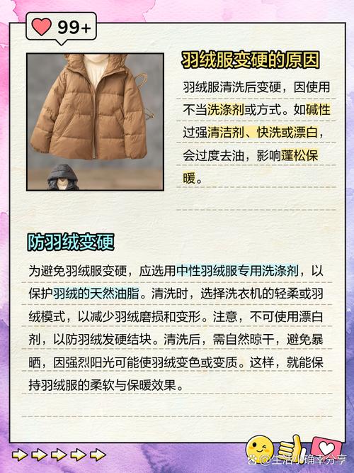 〖One〗、羽绒服面料变硬可能是由于使用了不合适的洗涤剂导致的。因此,建议使用专用的衣物洗涤剂来清洗羽绒服,这类洗涤剂通常对衣物纤维更加温和,有助于保持面料的柔软度。注意水温 清洗羽绒服时,水温的控制也非常重要。最佳水温为40到50摄氏度,这个温度范围既能有效清洁衣物,又不会对面料造成损伤。