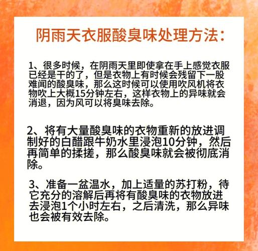 〖Six〗、如果急需拯救晾臭的衣服并着急穿,可以尝试以下几种方法: 重新清洗并浸泡 步骤:在清水中加入两勺白醋和半袋牛奶,将有异味的衣服放入其中浸泡10分钟,然后再进行正常的清洗流程。 效果:白醋和牛奶的组合可以有效去除衣物上的异味,让衣物恢复清新。