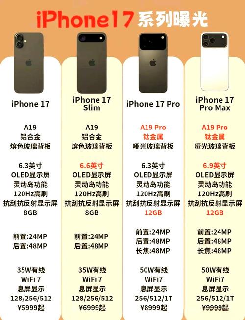 苹果17系列包含基础版和Pro系列,具体配置参数如下:基础版(iPhone 17)屏幕为3英寸OLED屏,支持120Hz高刷新率,色彩表现出色。性能上搭载A18芯片(3nm工艺),配备8GB内存,支持Wi-Fi 7和5G eSIM,多任务处理流畅。