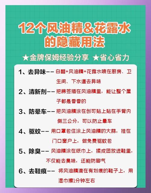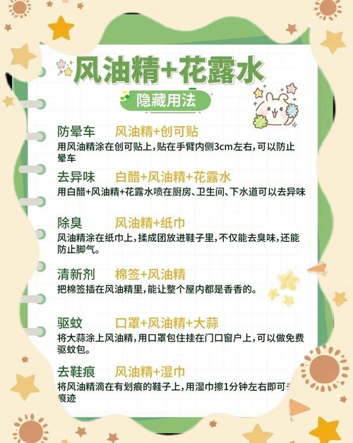 〖Two〗、花露水和风油精混合在一起的作用主要是增强驱蚊效果和舒缓蚊虫叮咬后的不适感,但花露水不建议在封闭空间下长时间大量使用。花露水和风油精混合的作用 增强驱蚊效果:花露水本身具有一定的驱蚊作用,而风油精中的薄荷脑、樟脑等成分也能有效驱赶蚊虫。将两者混合使用,可以进一步提升驱蚊效果。