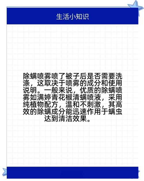 〖One〗、但要是喷洒量过多,被子有明显的潮湿感或刺鼻气味,或者使用的除螨喷雾含有化学成分且对人体有潜在危害,这种情况下就有必要清洗被子。过多的喷雾残留可能影响睡眠体验,化学成分还可能刺激皮肤和呼吸道。另外,如果使用除螨喷雾后,皮肤出现瘙痒、红肿等过敏症状,也应及时清洗被子,避免过敏原持续刺激身体。总之,是否清洗被子要根据实际情况灵活判断 。