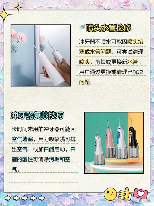 如果冲牙器水箱已加满水且设备有电,但仍然不出水,可能的原因与水质有关。新冲牙器在使用时,水质可能会影响其出水情况。如果在使用中发现突然不出水了,可能是压力不足。此时,建议采用白醋或水垢清洗剂进行清洗,以消除堵塞。问题现象:抽水机工作正常,抽水管嘴有吸水迹象,但喷嘴不喷水。