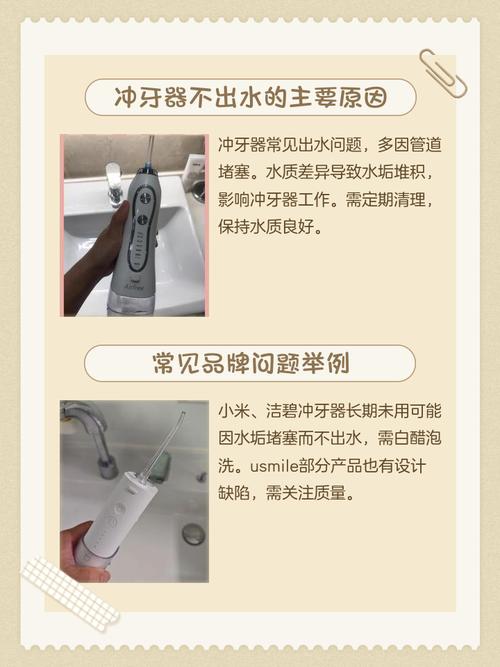 小米冲牙器F300不出水可能是由电机故障、单向阀片损坏或构造堵塞导致的。 电机故障 如果小米冲牙器F300的按键功能正常,但无法出水,很可能是电机出现了问题。电机是冲牙器产生水流的关键部件,一旦出现故障,就无法正常驱动水流。