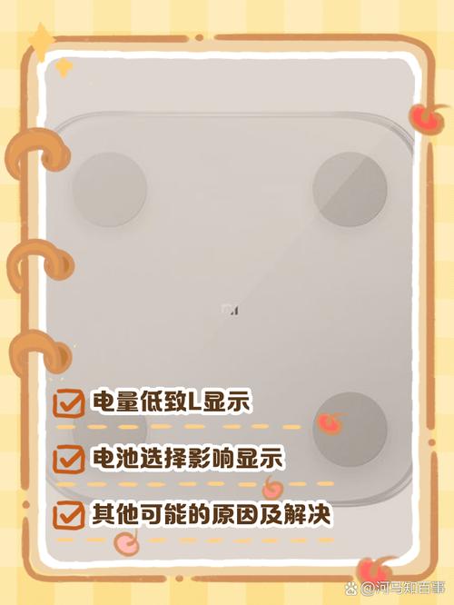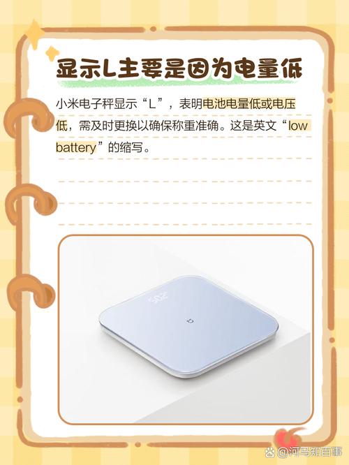 〖Three〗、小米体重秤显示L的含义 当小米体重秤在称重时显示L,这表示电池电量过低,需要及时更换电池。电量不足可能会影响称重的准确性。影响称重准确性的因素 导致小米体重秤测量体重不准的主要因素包括:饮食前后体重的波动、早晚体重的误差、运动前后的体重变化、站姿不稳以及摆放的地面是否平整等。