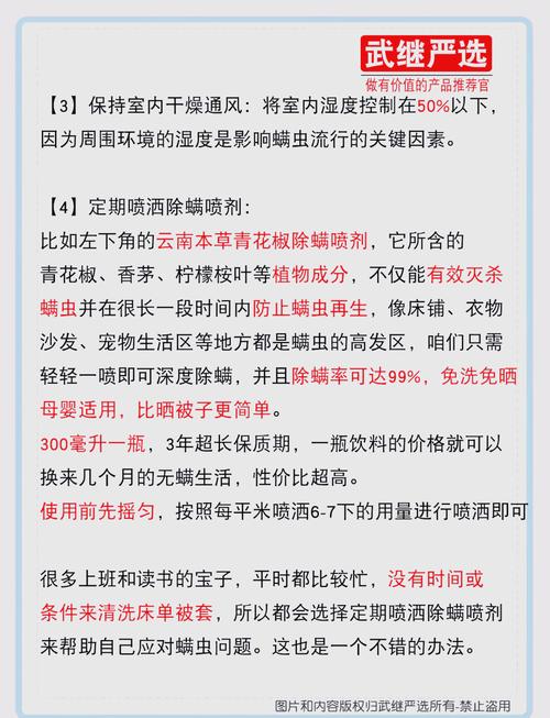 〖Four〗、风油精混合医用酒精和花露水去螨效果较好。以下是具体分析:成分协同作用:风油精、医用酒精和花露水混合后,可以形成一种有效的去螨溶液。医用酒精具有杀菌消毒的作用,花露水含有一定的香精成分,可以使环境更加清新,而风油精则具有一定的刺激性气味,对螨虫有一定的驱赶作用。