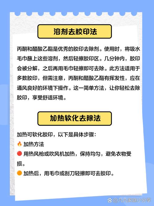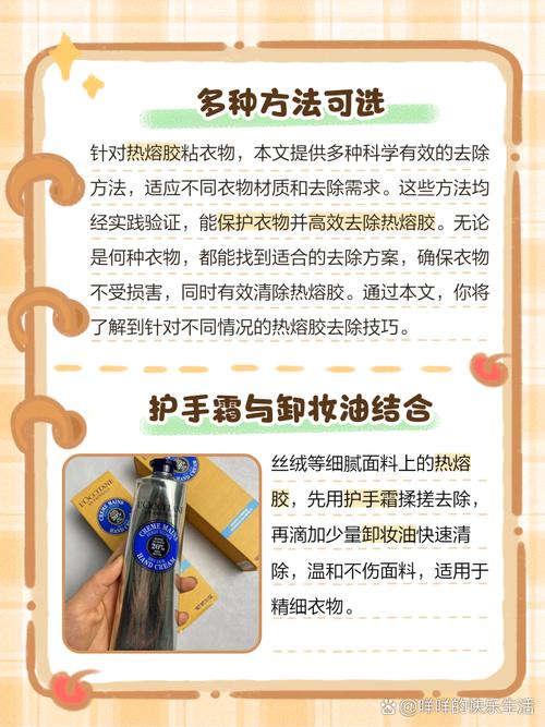 还可以使用专用的去胶剂,按照说明涂抹在热熔胶处,稍等片刻后擦拭干净。另外,食用油也有一定的效果,在热熔胶上滴几滴食用油,过一会儿就能慢慢擦掉。 **利用吹风机加热**:吹风机的热风能使热熔胶的分子结构发生变化,变得柔软且粘性降低。当热熔胶变软后,用手轻轻揉搓,它就会逐渐脱离外套。