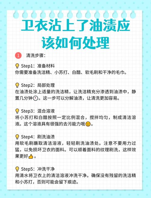 〖One〗、去除纯棉卫衣上的顽固油渍,可以采取以下几种方法:使用洗洁精:在油渍处滴上几滴洗洁精,确保洗洁精完全覆盖油渍区域。将卫衣浸泡在含有洗洁精的水中约二十分钟。这样可以有效地将油渍洗掉。使用牙膏:在油渍上涂抹少许牙膏。轻轻揉搓,利用牙膏的清洁力去除油渍。