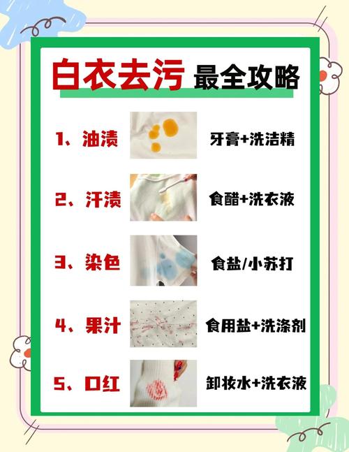 针对酱油渍的去除,可以采取以下步骤:首先将衣物沾湿,只湿润油渍部分。随后,在油渍上撒上一些白糖,白糖能中和酱油成分并助其溶解。进行手搓后,用清水冲洗干净即可。 对于普通油渍的处理,可以采取以下方法:将白衣服完全浸泡在温水中,然后在油渍处撒上少量苏打粉。苏打粉能分解多数油渍。