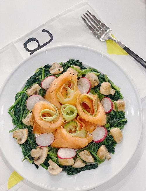 〖Two〗、烟熏三文鱼卷 材料:烟熏三文鱼、奶油芝士、黄瓜、鳄梨、薄煎饼或面包片。做法:a. 将奶油芝士涂在薄煎饼或面包片上。b. 铺上一层烟熏三文鱼。c. 添加切成条状的黄瓜和鳄梨。d. 将其卷起,切成小段即可食用。烟熏三文鱼沙拉 材料:烟熏三文鱼、混合蔬菜沙拉、橄榄油、柠檬汁、盐、黑胡椒、蜂蜜。