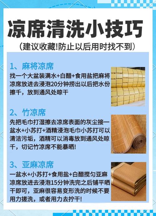 〖Three〗、夏天到来,尽管还未进入最炎热的时候,但凉席的使用已经可以提上日程了。无论是新凉席还是使用过一段时间的,或者是存放了一冬的,都需要清洗一次,以保证其使用寿命。那么,凉席该如何清洗呢?让我们根据不同的凉席材质来探讨一下。