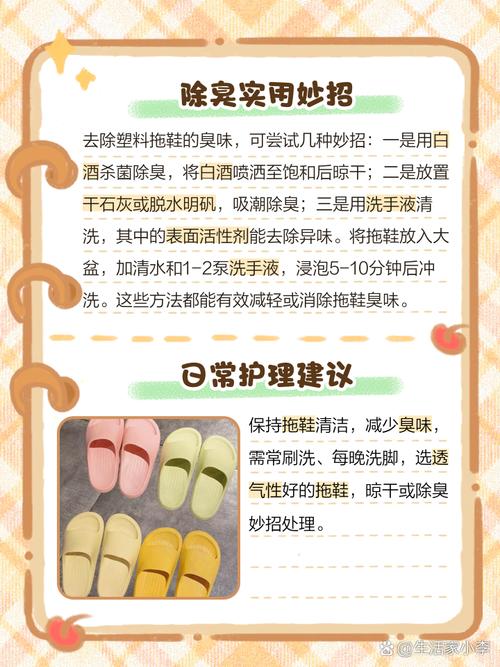 〖Two〗、夏天拖鞋有臭味,可以通过以下几种方法去除:日常清洁与晾晒 定期清洗:使用温和的洗涤剂和软毛刷清洗拖鞋,特别是鞋底和拖鞋内部,以去除污垢和细菌。清洗后,用清水冲洗干净,确保没有洗涤剂残留。彻底晾干:清洗后,将拖鞋放在通风良好、阳光充足的地方晾干。阳光中的紫外线有助于杀灭细菌,减少臭味。