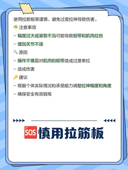 〖Four〗、运动完拉伸只用拉筋板是可以的。拉筋板作为一种辅助腿部肌肉拉伸的工具,能够帮助进行运动后的拉伸。但使用时需要注意以下几点:操控难度:拉筋板不太容易操控,需要一定的平衡能力和技巧。时间与强度:使用时间太长或是抗压强度过大,容易导致肌肉拉伤。