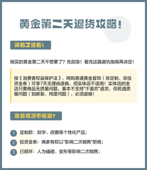 实体店买的黄金第二天是否可以退货,需视具体情况而定。非定制黄金饰品 如果购买的黄金饰品是非定制的,一般情况下,消费者可以在收到商品之日起七日内进行退货。但需要注意以下几点:退货条件:黄金饰品需保持原样,不影响二次销售,即未出现磨损、变形、汗渍等情况。
