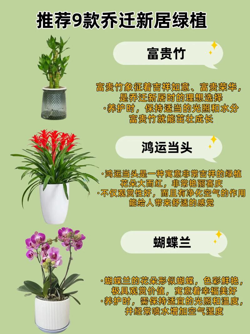 〖Two〗、乔迁新居进门仪式花可以选取具有吉祥寓意的花束、定制专属的手工花束、发财树盆栽或蝴蝶兰组合。选取具有吉祥寓意的花束:如百合花束,寓意百年好合。白百合+粉玫瑰+尤加利叶的经典组合,既象征纯洁永恒又暗含浪漫柔情。香槟色调的花束适合摆放在新家玄关,搭配镂空陶瓷花瓶更能增强开门见喜的吉祥寓意。