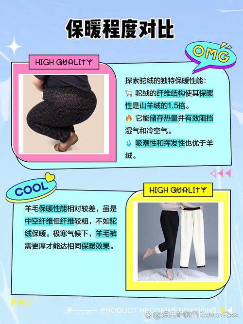 〖Five〗、羊毛裤和驼绒裤相比,驼绒裤更保暖哦!驼绒裤的超级保暖力:驼绒裤是用骆驼腹部的毛做的,这种毛可是动物纤维里最能抗寒的!就像给身体穿了一层小棉袄,特别适合北方的朋友们,让你们冬天也能暖洋洋的。驼绒裤的优点多多:它不仅保暖,还特别防潮,弹力也好,穿上很贴身又透气。