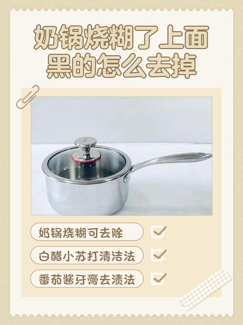 清除烧干奶锅的黑色焦痕,关键是软化碳化物并选用合适工具。 ### 清理步骤与方法 ① 小苏打+白醋浸泡法:将水没过焦痕后煮沸,倒入2勺小苏打+50ml白醋,静置20分钟,用软布或木铲轻擦即可。酸性与碱性反应可分解顽固污渍。