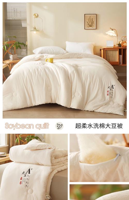 〖Two〗、而且大豆纤维被子通常比较轻盈,盖在身上不会有厚重感,这在一定程度上也有助于提升保暖感受,让人感觉舒适自在。 **材质构成差异**:大豆纤维被子主要由大豆蛋白纤维制成,这种纤维是从大豆中提取的。而其他被子材质多样,比如棉被主要是棉花,羽绒被是鸭绒或鹅绒等。