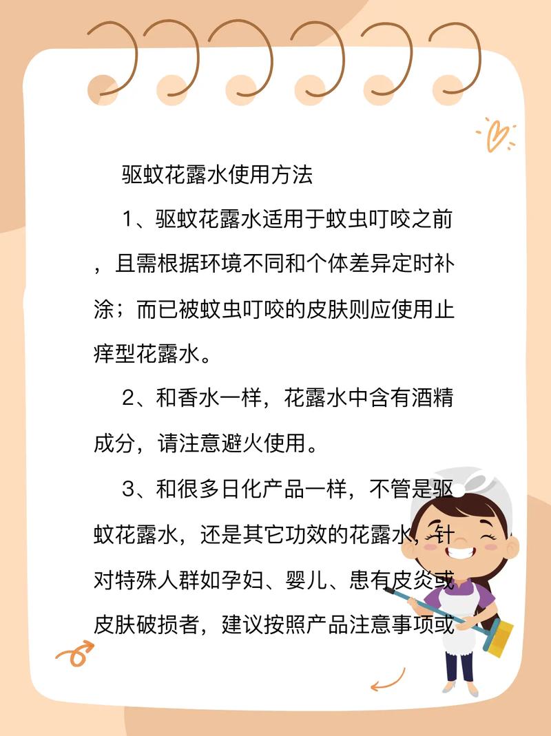〖Five〗、正确涂抹方式 花露水需均匀覆盖裸露皮肤,喷洒或涂抹时与皮肤保持15厘米距离,重点处理手腕、脚踝、颈部等蚊子易叮咬部位。喷洒衣物时避开真丝等易染色材质,避免涂抹伤口或眼周敏感区域。时效与补涂 普通花露水有效防蚊时间为2『3』小时,户外活动出汗或遇水后需立即补涂。