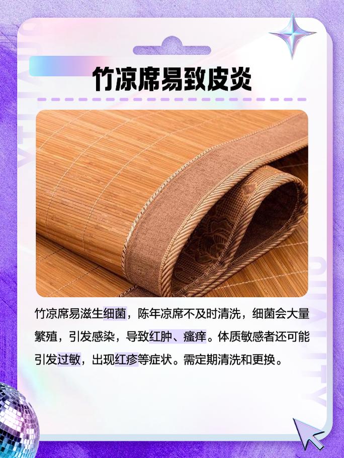好处: 降温神器:睡凉席就像给身体开了个小风扇,让人感觉超级凉爽,特别适合炎炎夏日。坏处: 皮肤病风险:夏天汗多,凉席缝隙里容易藏污纳垢,螨虫啥的就会趁机而入,让你皮肤瘙痒、红肿,甚至得皮肤病哦。