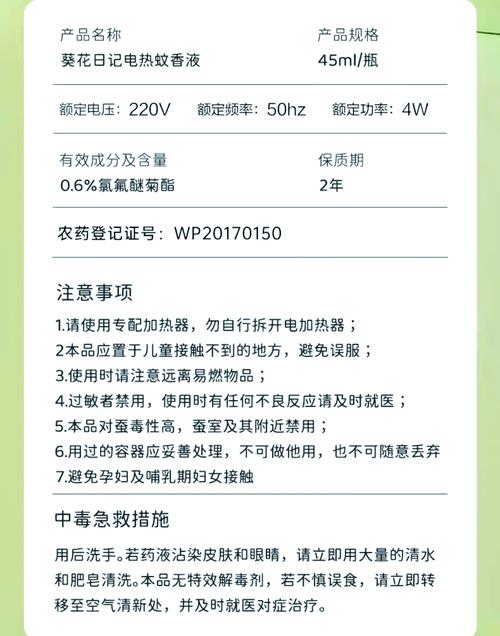 〖Five〗、注意安全使用:在使用蚊香液时,无论插在墙壁插座还是插板上,都需要确保蚊香液瓶直立放置,以防止药液泄漏引发事故。同时,湿手时请勿触摸加热器,加热器工作时也不要触摸或插入任何物体,以免造成安全隐患。此外,使用蚊香液时还需要注意加热器的使用寿命、选取大牌蚊香产品以及注意过敏反应等问题。
