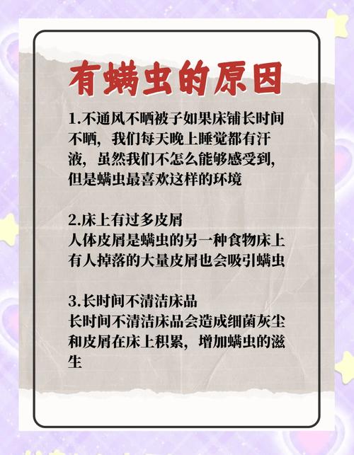 〖Two〗、除螨方法 定期大扫除 让我们来给床上用品做一次大扫除吧!记得定期清洗和更换床单、被套、枕头等,这可是防止螨虫安家的关键步骤哦。 保持通风 另外,记得保持室内通风,经常开窗换气,让室内保持干燥。这可是减少螨虫滋生的好方法。 使用除螨剂 如果觉得还不够安心,不妨在床上用品上使用一些除螨剂。
