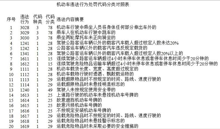 〖Two〗、违章代码表示货运机动车违反规定载人。解析如下:法规依据:该违章行为违反了《中华人民共和国道路交通安全法实施条例》的第55条第2项,同时也触犯了《中华人民共和国道路交通安全法》的第50条,并依据该法的第90条进行处罚。