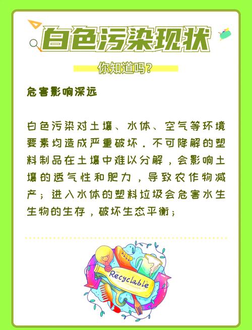 白色污染是一种环境问题,它主要是由塑料制品和塑料垃圾引起的。这种污染在自然环境中难以降解,因此会对我们的生态系统造成长期的危害。白色污染的具体危害包括: 对生态环境的影响:塑料垃圾进入水体后,可能会被海洋生物误食,导致动物受伤甚至死亡。此外,塑料垃圾的堆积也会破坏湿地和其他自然环境,影响生态平衡。