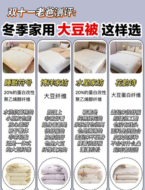 〖Four〗、大豆被50%和80%的核心区别在于纤维含量和功能性。 材质构成 50%大豆被通常指填充物中大豆蛋白纤维占50%,剩余多为聚酯纤维。这类被子兼顾一定天然材质的亲肤性,但化纤占比更高,成本较低。