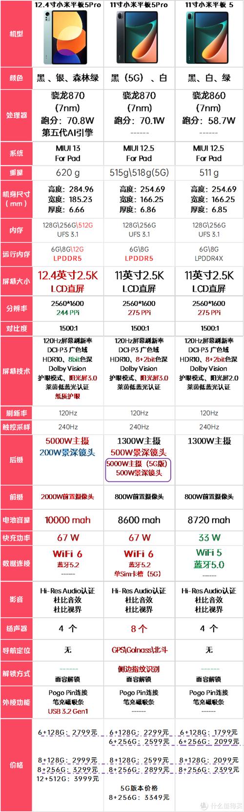 〖Three〗、费用与配置差异小米平板5提供6+128G(1999元)和6+256G(2299元)两种版本;小米平板5 Pro则有6+128G(2499元)、6+256G(2799元)和8+256G(3499元)三款配置。Pro版费用更高,但存储和运行内存选取更丰富,适合对多任务处理或大型应用有更高需求的用户。