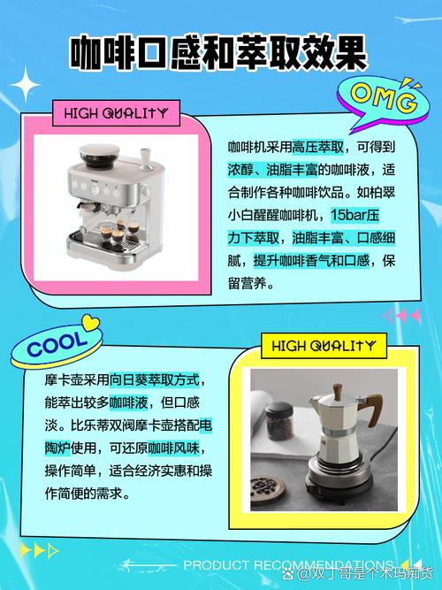 〖Two〗、浓郁口感:摩卡壶能提取浓郁的咖啡味道,适合喜欢浓郁咖啡口感的人群。 费用亲民:相较于部分高级咖啡机,摩卡壶的费用更为亲民,适合预算有限的消费者。咖啡机的优势: 自动化操作:现代咖啡机具备自动化功能,如自动磨豆、自动压粉、自动加热等,极大提高了便利性。