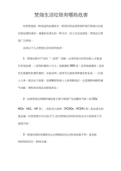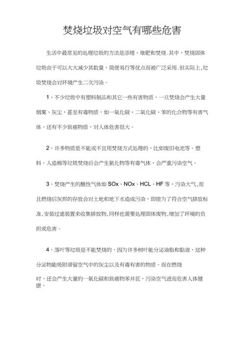 〖Six〗、焚烧垃圾的危害主要包括以下几个方面:空气污染 焚烧垃圾会释放出大量恶臭和有毒气体,如含硫气体等。这些气体不仅气味难闻,更重要的是它们对空气质量造成严重影响。焚烧过程中产生的粉尘和细小颗粒物会随风飞扬,导致空气中二氧化硫悬浮颗粒物超标,进而可能引发酸雨现象和扬尘污染。