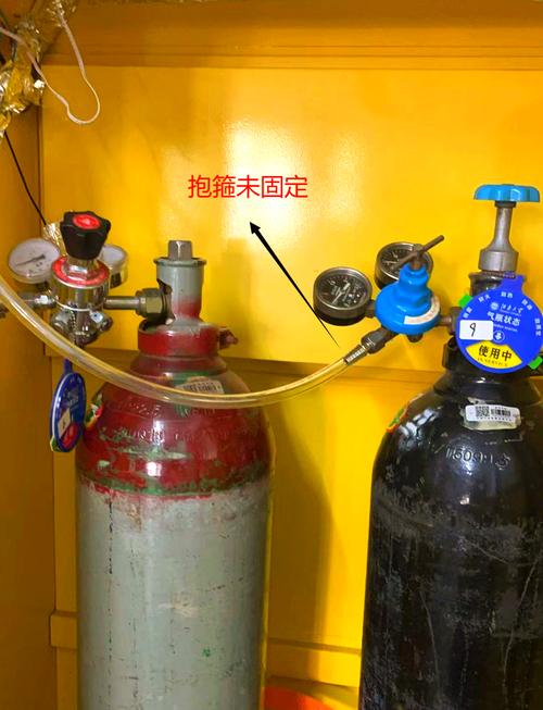 不同气瓶不能混放,空瓶与装有气体的瓶应分别存放;在实验室中,不要将气瓶倒放、卧倒,以防止开阀门时喷出压缩液体。要牢固地直立,固定于墙边或实验桌边,比较好用固定架固定;接收气瓶时,应用肥皂水试验阀门有无漏气,如果漏气,要退回厂家,否则会发生危险。