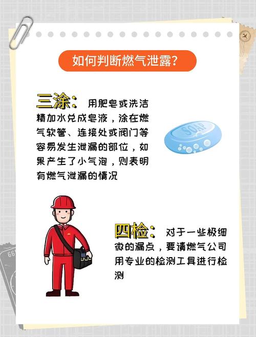 肥皂水涂抹法介绍 肥皂水涂抹法是一种简单易行的检查燃气用具漏气的方法。其原理在于,当燃气泄漏时,泄漏点会产生微小的气泡。通过涂抹肥皂水,能够更容易地观察到这些气泡,从而准确找到漏气点。肥皂水涂抹法操作步骤 制作肥皂水:将肥皂和水按一定比例混合,制成肥皂水。