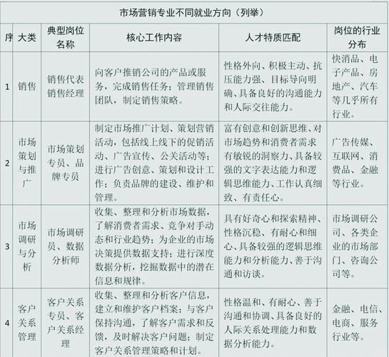 市场营销专业就业前景较为广阔,核心就业方向包括销售人员、市场研究人员、经营类专员等岗位,且随着互联网发展衍生出整合营销等新兴领域,但需具备吃苦精神与持续学习能力。具体分析如下:销售人员:销售人员是营销领域最基础且需求量最大的岗位。其特点为“宽进严出”——入职门槛低,但做好难度高。