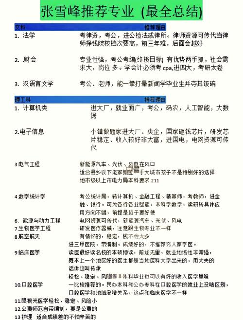 〖Two〗、张雪峰建议文科男生专科可以选市场营销专业和投资学专业。以下是具体分析:市场营销专业:专业特点:市场营销专业涉及广告学、营销学、人际沟通学、推销学等知识,是一个文理兼招的专业,尤其适合文科生。职业前景:毕业生多从事销售工作,而销售岗位在任何经济环境下都是不可或缺的。