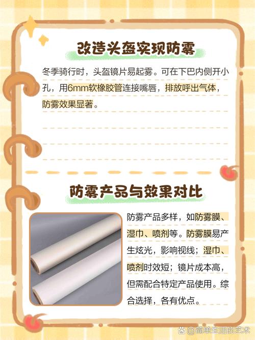 〖Four〗、另一种方法是使用浓肥皂水或洗碗净水溶液擦拭头盔玻璃内表面。具体操作步骤为:将肥皂水或洗碗净水溶液均匀涂抹在头盔镜片内侧,然后静置让其自然风干。这种方法的效果可以持续一周左右,能够在一定程度上减少起雾现象。不过需要注意的是,这种方法需要定期重复操作,以保持防雾效果。