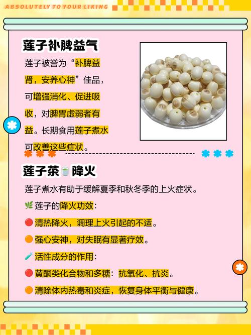 〖Four〗、干莲子泡水喝的方法如下:清洗与浸泡:将干莲子清洗干净,去除表面的灰尘和杂质。加入适量的水浸泡两小时,使莲子充分吸收水分并膨胀。这一步是确保莲子能够煮透并释放出营养成分的关键。煮制:将浸泡好的莲子放入锅中,加入足够的水。用大火将水煮开,然后转小火慢炖30分钟。