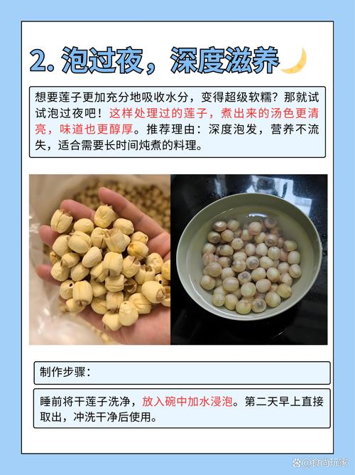 〖One〗、冷水浸泡:干莲子比较好提前用冷水浸泡,时间一般为1两小时,使莲子充分吸收水分并膨胀。如果是新鲜莲子,则无需浸泡,直接下锅煮即可。温水浸泡:温水也可以用来泡发莲子,时间相对较短,同时能保证营养物质不流失。但需注意,不宜用开水长时间浸泡,以免破坏营养成分。处理莲子芯:莲子芯味苦,如果不喜欢苦味,可以在浸泡后去掉。