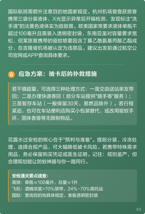 〖Two〗、综上所述,火车安检不能带六神花露水,这是由于其易燃性质以及火车安检的相关规定所决定的。为了您和他人的安全,请遵守相关规定,不要携带易燃易爆等危险物品上火车。