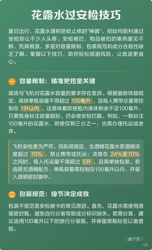 〖One〗、选取小容量瓶装花露水:安检规定通常要求每瓶液体不得超过100毫升。因此,携带小瓶装花露水可以确保其符合容量限制。 将花露水放入透明塑料袋:将花露水和其他液体产品放入透明塑料袋中,这样安检人员可以清楚地看到里面的内容物,便于检查。