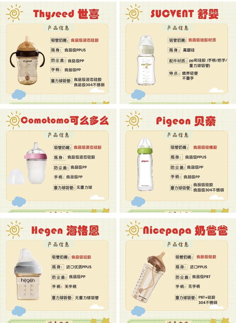 〖Five〗、缺点:易沾灰尘:表面可能吸附毛絮。费用较高:部分品牌较贵。适合人群:对胀气敏感的宝宝,或需要柔软奶瓶的过渡期。 其他材质注意事项 避免PC(聚碳酸酯):可能含双酚A,已被多国禁用。Tritan材质:安全无味,耐摔,但耐高温性略差(建议不超过100℃)。
