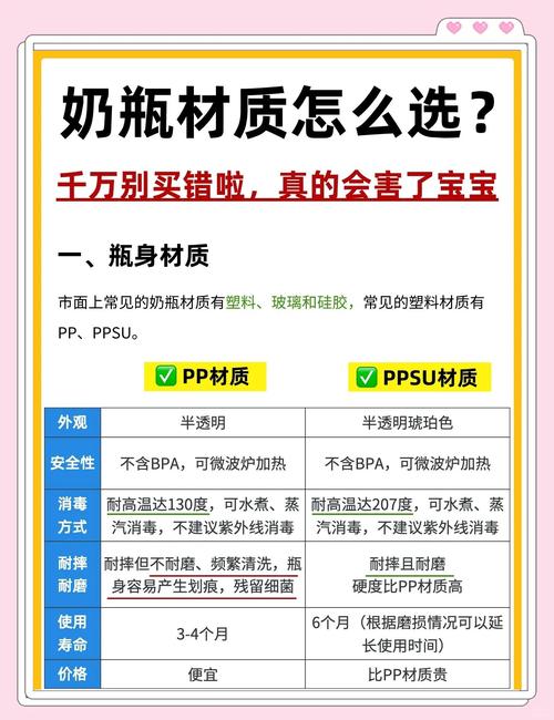 〖Three〗、材质:常见的塑料奶瓶材质有PC、PP、PES、PPSU等。其中,PC材质因遇100℃高温时会释放有毒物质双酚A而被部分国家和地区禁止使用,近来市场上主流的塑料奶瓶多采用PP、PES、PPSU等不含BPA的材质。特点:轻便,不易破碎,但耐高温性能和使用寿命可能因材质不同而有所差异。硅胶奶瓶:材质:由硅橡胶制成。