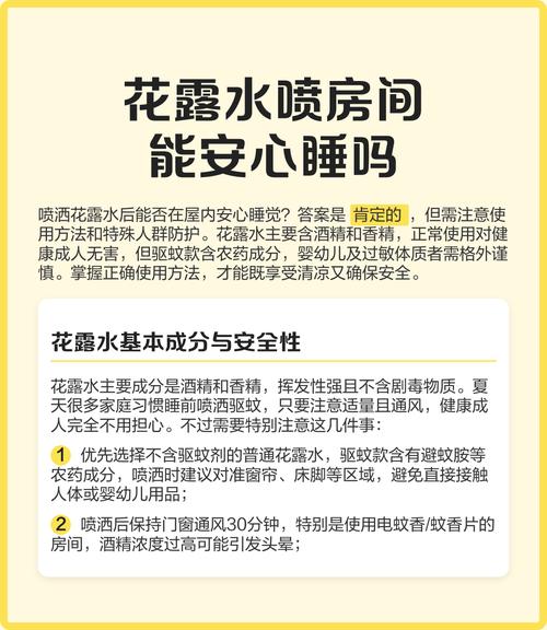 花露水喷到屋里后一般是能睡觉的,但存在特殊情况需注意。通常情况:花露水的主要成分包含酒精、香精、驱蚊剂等,正常在屋内适量喷洒,这些成分不会对人体产生严重危害,还能起到驱蚊、散发宜人香味的作用,所以不会影响正常睡觉。