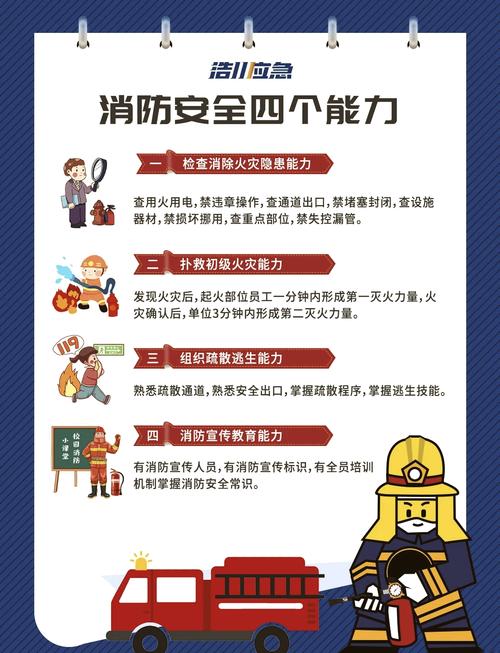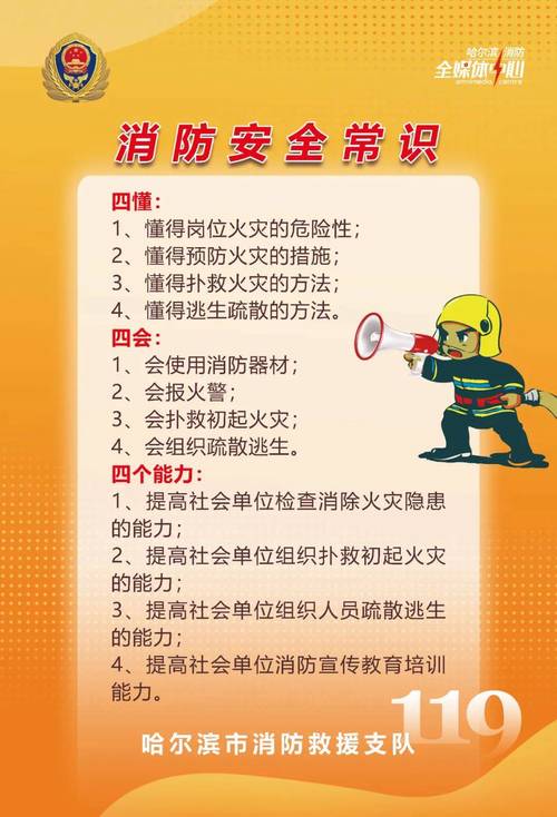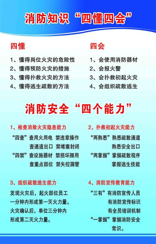 消防工作中的五知四会是关键要素。首先,四会包括掌握消防器材的使用方法、学会报警、扑救初期火灾以及组织疏散逃生。其次,五知要求在火灾发生时,能够迅速发现火情、报警、扑救初期火灾、启动备用消防设备以及组织人员疏散。此外,消防工作的四懂四能力同样重要。