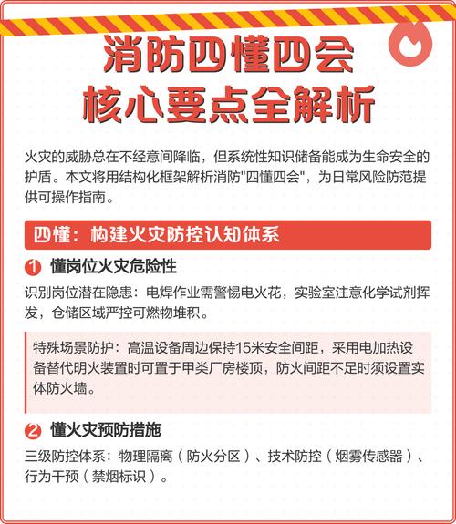 大家好,今天来为大家分享消防四懂四会的内容是什么的一些知识点,和消防四懂三会的内容是什么呢的问题解析,大家要是都明白,那么可以忽略,如果不太清楚的话可以看看本篇文章,相信很大概率可以解决您的问题,接下来我们就一起来看看吧!