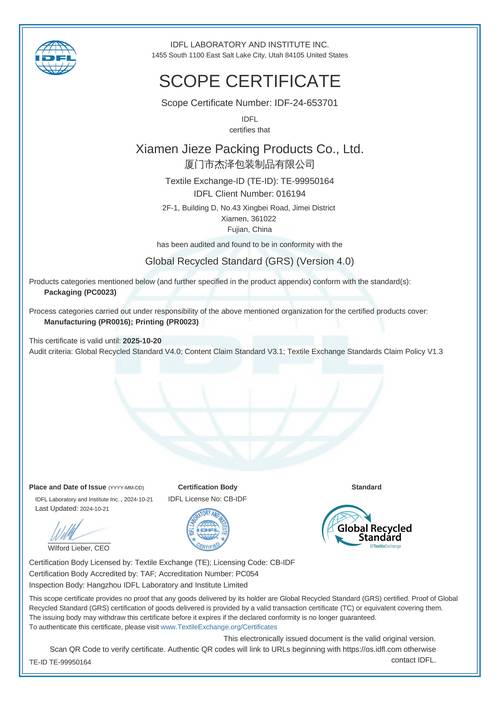 〖Four〗、GRS认证(Global Recycled Standard,全球回收标准)是一个针对再生材料产品的世界环保认证标准,旨在验证产品中再生材料的含量及生产过程的社会、环境与化学合规性,核心目标是推动资源循环利用和可持续发展。