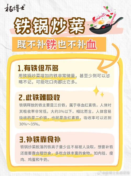 〖Two〗、用铁锅炒菜能有效补铁的说法不靠谱。具体原因如下:亚铁离子难以吸收:虽然用铁锅烹饪可以产生少量亚铁离子,但这些无机离子很难被人体吸收,因此补铁效果极其有限。